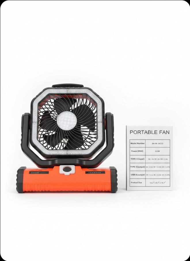 Iluminación Integrada: Incluye un anillo de luz LED alrededor de las aspas, lo que lo hace ideal para camping o emergencias.
